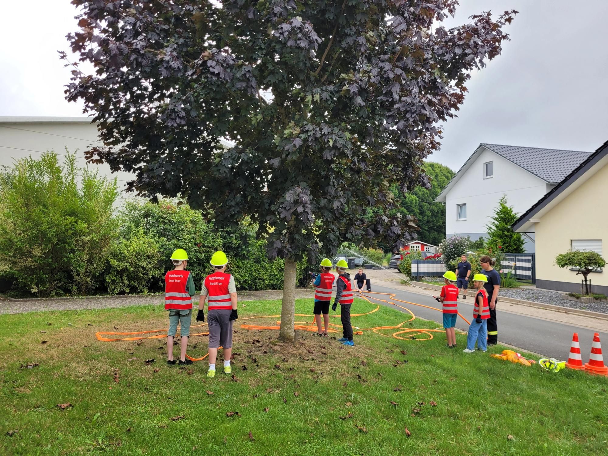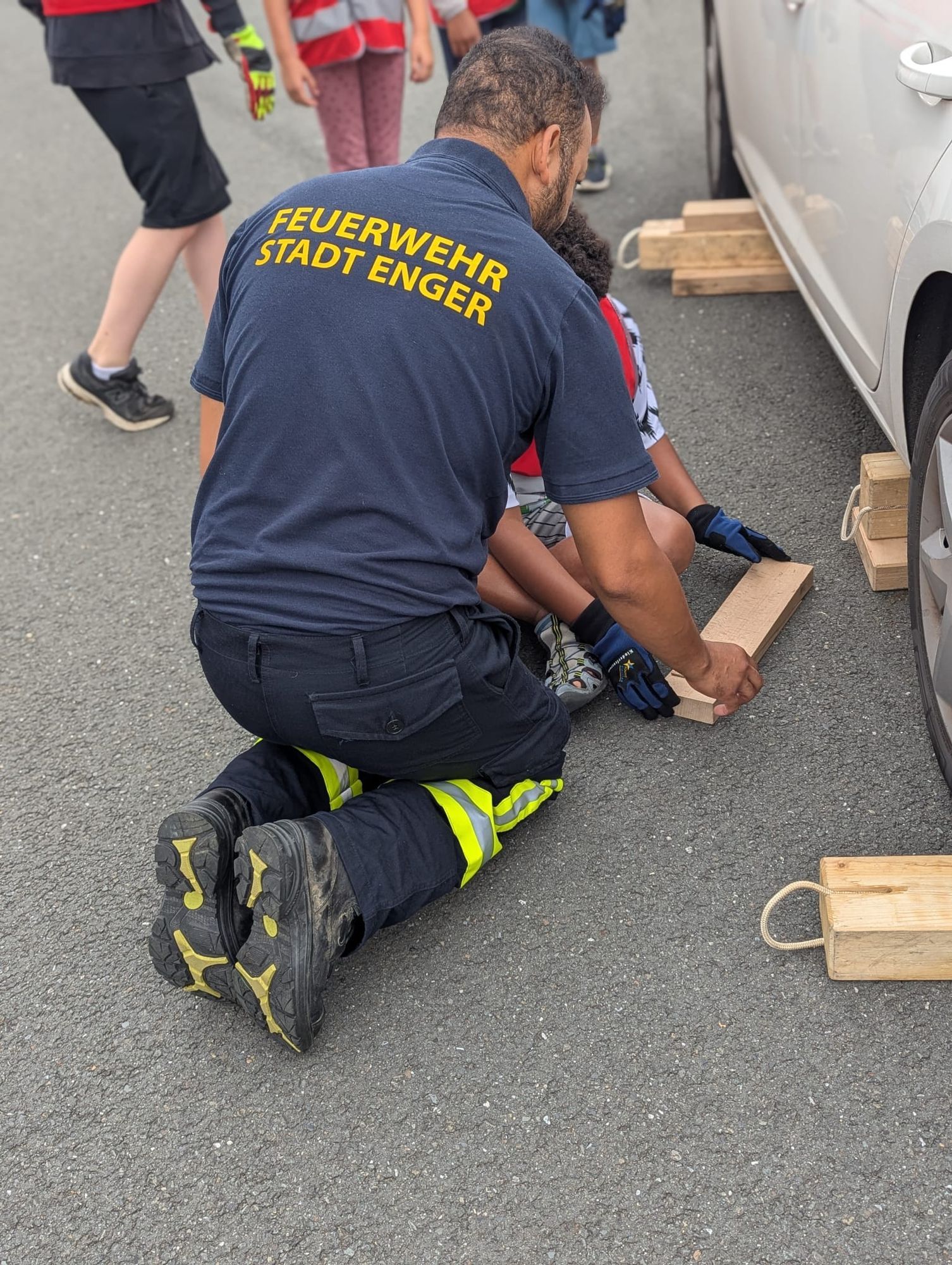 Am Gerätehaus Enger-Nord wurden verschiedene Einsatzszenarien vorbereitet, die die Kinder spielerisch abarbeiten durften. So wurden die Blaulichtblitze zu einer Türöffnung und einer Tragehilfe gerufen. In einem abgedunkelten Raum war zudem ein Teddy vermisst, den die Kinder suchen mussten und erfolgreich aus dem Gebäude retteten. Draußen am Gerätehaus wurde ein Löschangriff mit 3-D-Rohren aufgebaut und bei einem gemeldeten Verkehrsunfall wurde ein Auto mit Holz unterbaut.